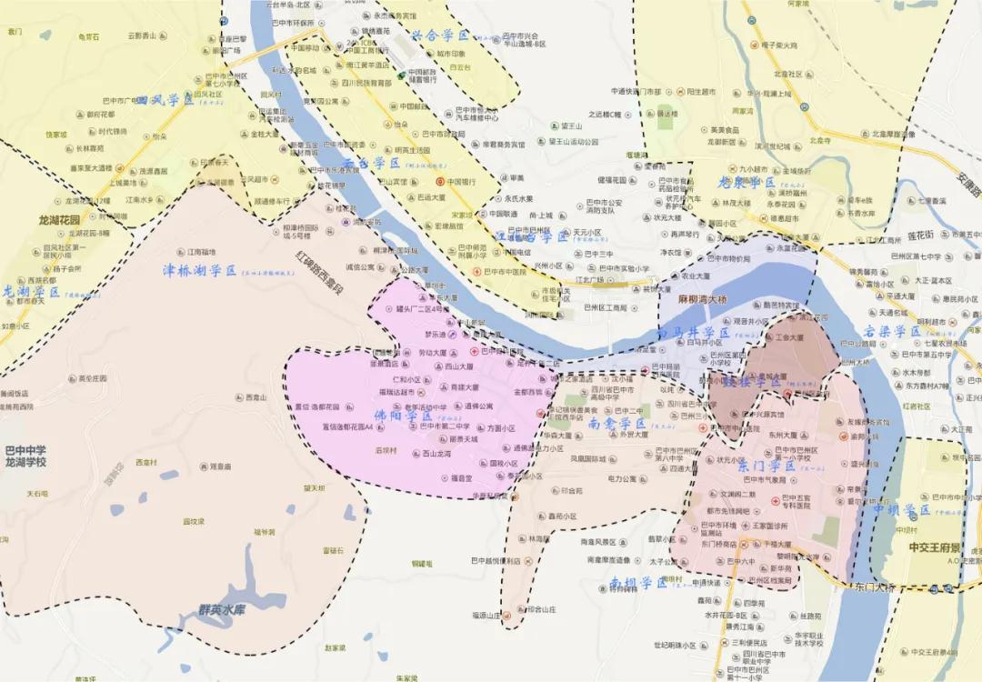 津桥湖学区(区四小津桥湖校区服务区域):红军路588号及以西,红军路812号、桂花街375号、350号及黄家坪街,津桥湖、龙湖御景(含)、洪湖居(含)一线以东南,巴中中学龙湖校区及以东,西龛社区、莲山湖社区。