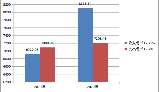 2020年度收入总计8118.34万元;支出总计7208.48万元。与2019年相比,收入总计增加1196.29万元,增长17.28%;支出总计增加118.52万元,增长1.67%。